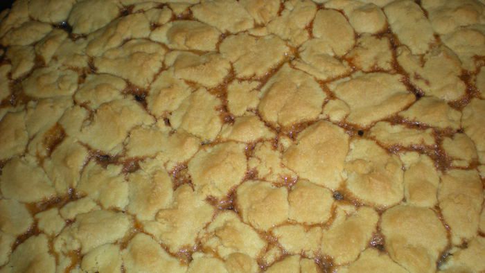Большую часть выкладываем на дно и руками распределяем по дну. Небольшая хитрость: на тесто немного под начинку посыпаю крахмал, совсем чуть-чуть...Это для того, чтобы под жидким варением тесто не мокло )))
