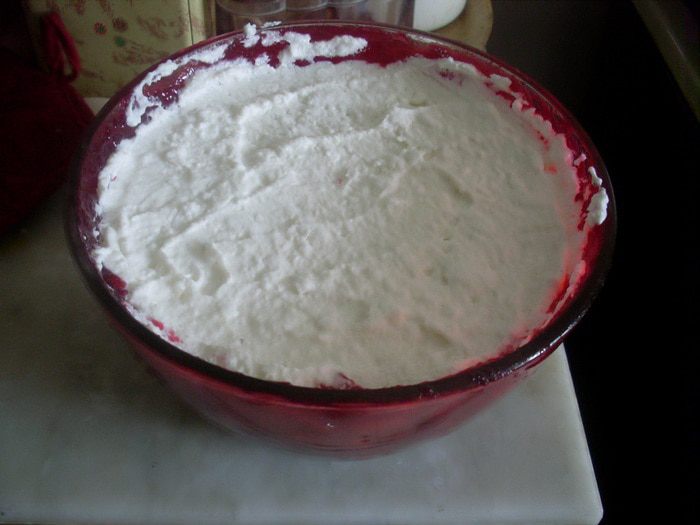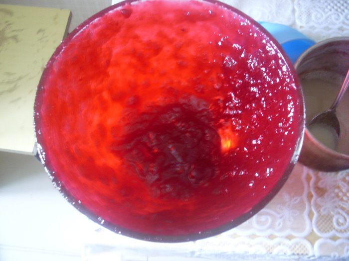 Быстро смешать белки с творогом и выложить в миску со смородиновым желе. Поставить в холодильник и подождать минимум 40 минут. Чтобы вынуть десерт, надо опустить его в миску с горячей водой (предполагалось на 30 секунд, но мне не помогли и 2 минуты, поэтому я провела по стенкам ножом и перевернула на тарелку).