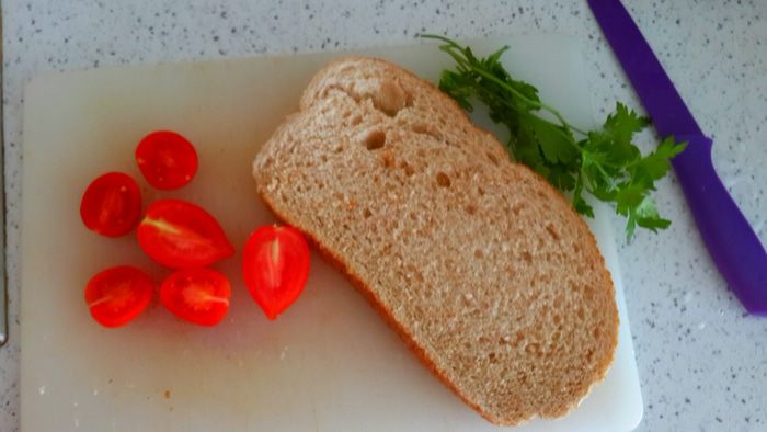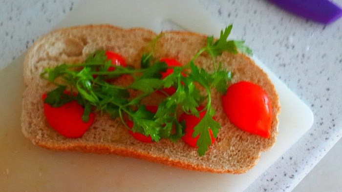Разрезать пополам помидоры черри( но это не принципиально. Можно и другие мелкие помидорки). Положить на хлеб. Сверху петрушку.
