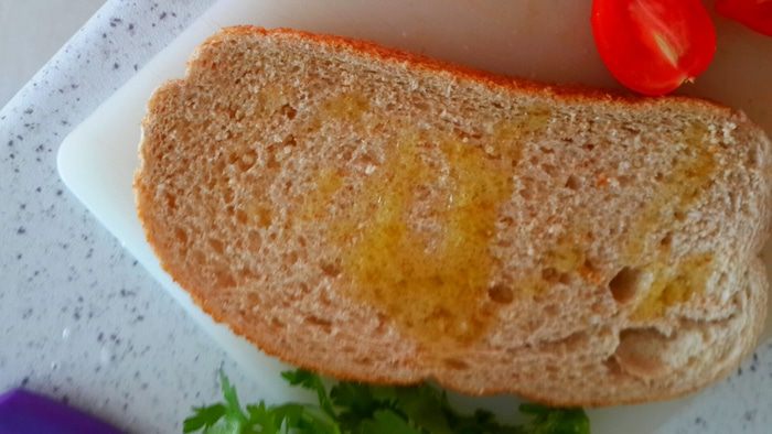 Сбрызнуть кусочек хлеба оливковым маслом. Там где будет масло, там и будет мягкий хлебушек. Вокруг будет хрустящий.