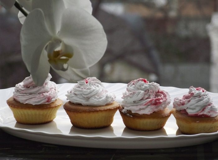 Капкейки с кремом можно готовить на любые праздники, и вы всегда будете уверены, что они произведут фурор среди ваших гостей. Мои капкейки сегодня – это лимонные кексики, покрытые кремом из взбитых сливок и и малинового пюре.
