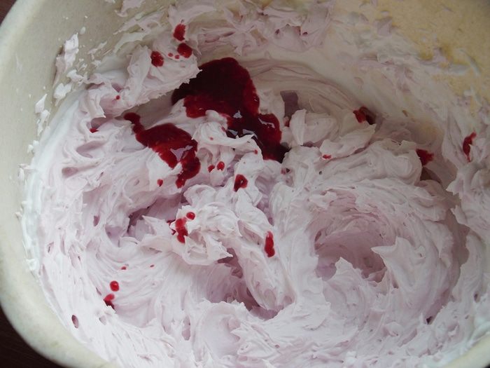 Миксером взбиваем сливки с ванильным сахаром в крепкую массу. Разделяем крем на 2 части. Отдельно в блендере взбиваем малину с сахаром (150 гр) . Во вторую часть добавляем половину малинового пюре и перемешиваем со сливками.
