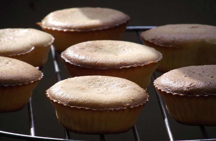 Ложкой убрать тесто со стенок миски по мере необходимости, и снова перемешать миксером на низкой скорости, чтобы тесто было однородным. Равномерно заполнить тестом подготовленные формочки и выпекать в течение примерно 18 — 22 минут.