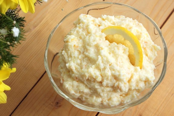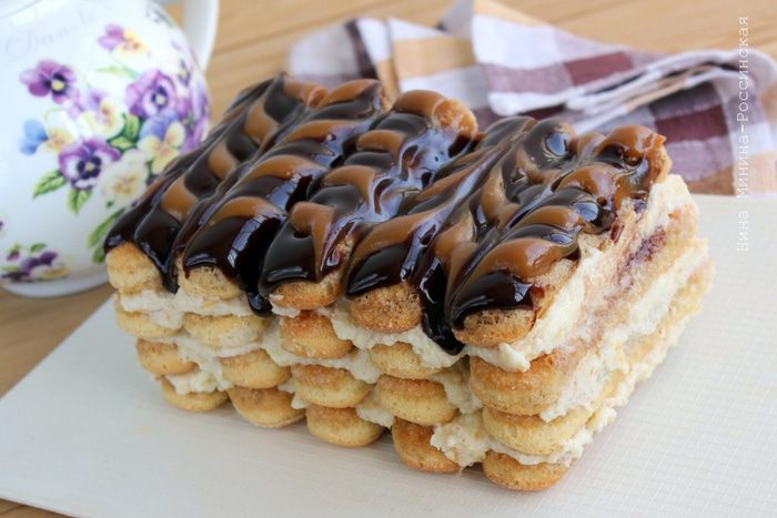 Соедините кофе, сваренный на ваш вкус, с коньяком. Окунайте сахарной стороной каждое печенье савоярди в кофе и выкладывайте их слоями (пропитанной стороной вверх) по пять штук, промазывая лимонным кремом.