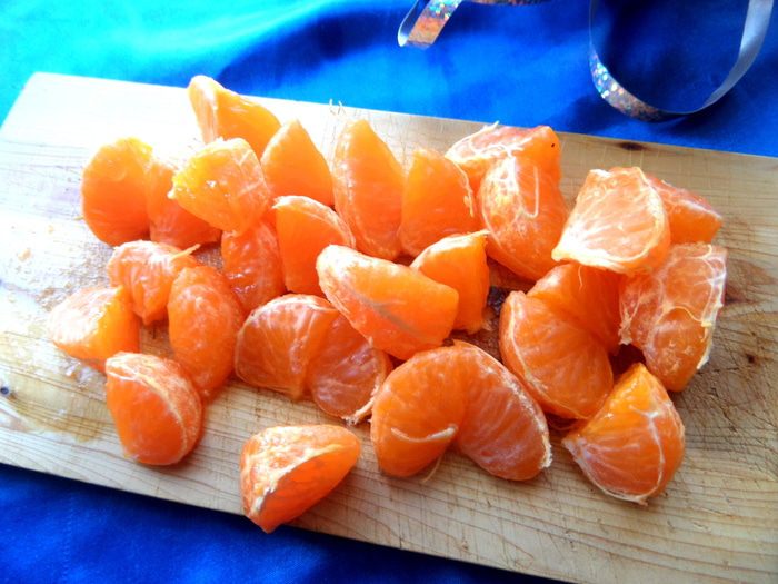Помыть,очистить от кожицы,проверить в мандаринах косточки.
