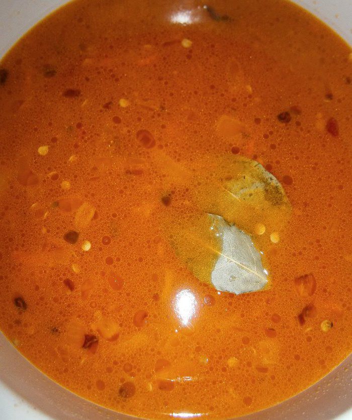 Выложить обжаренную массу в кастрюлю, долить 1,2 литра горячей воды, добавить 2 лавровых листа. Довести до кипения, и варить на небольшом огне 20 минут.