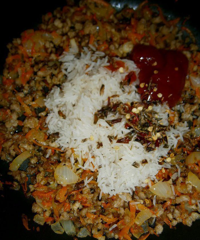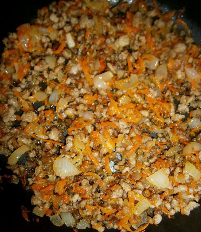 Фарш обжарить на небольшом количестве растительного масла в течении 2 - 3 минут.