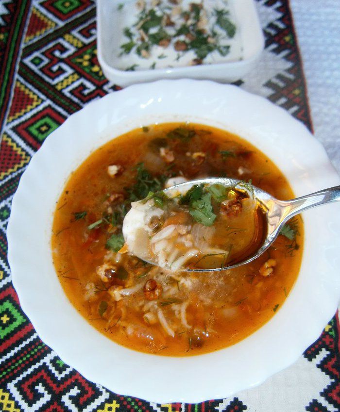 Подавать такой суп с густым йогуртом, грецкими орехами и зеленью.