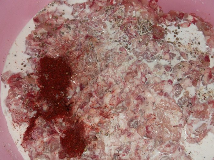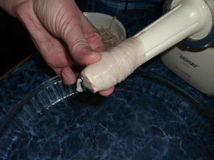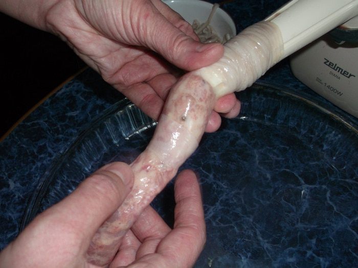Натуральную оболочку обычно продают обсыпанную солью, чтобы убрать запах и излишки соли замочить на ночь в холодной воде и хорошо промыть. Я набивала при помощи электромасурубки. Длина колбасок может быть любой.
