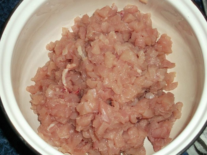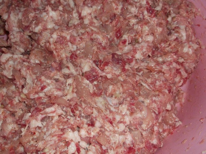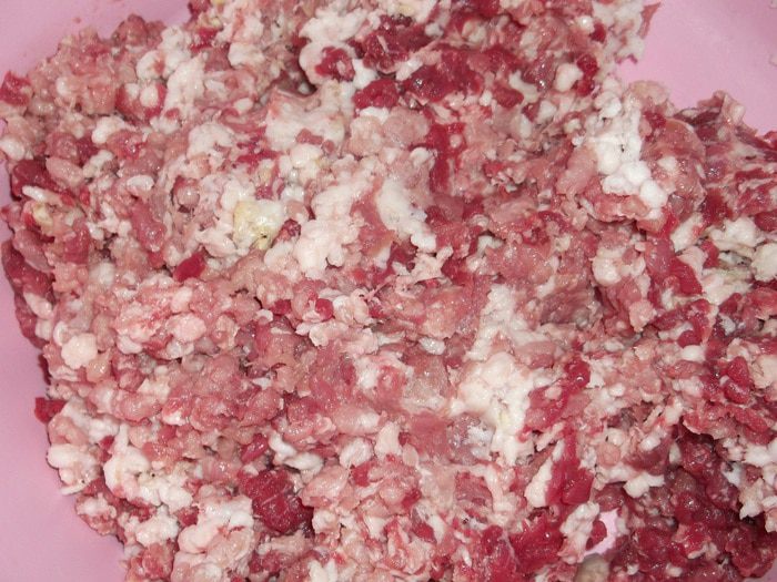 Свинину с салом перекрутить на крупную решетку с чесноком.