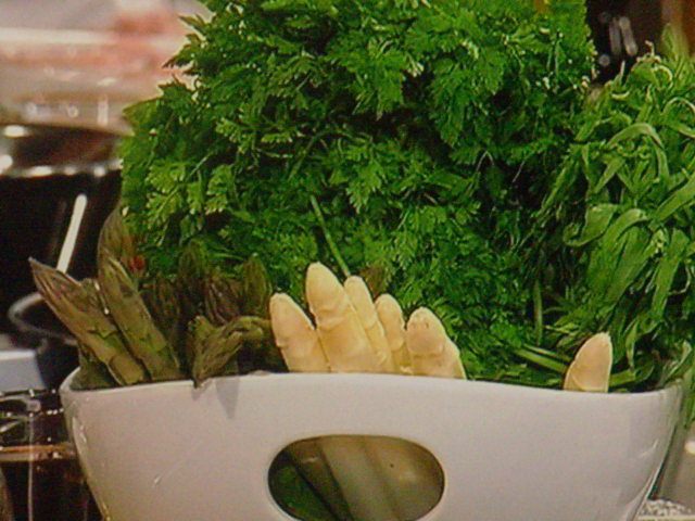 Подготовить овощи: спаржу почистить, отрезать плотные концы, порезать на бруски в 2 см. Зелёный лучок промыть и так же порезать наискосок на бруски примерно такого же формата. Оставшийся имбирь натереть на мелкой тёрке, а оставшийся чеснок мелко покрошить. Картошку очистить и нарезать.