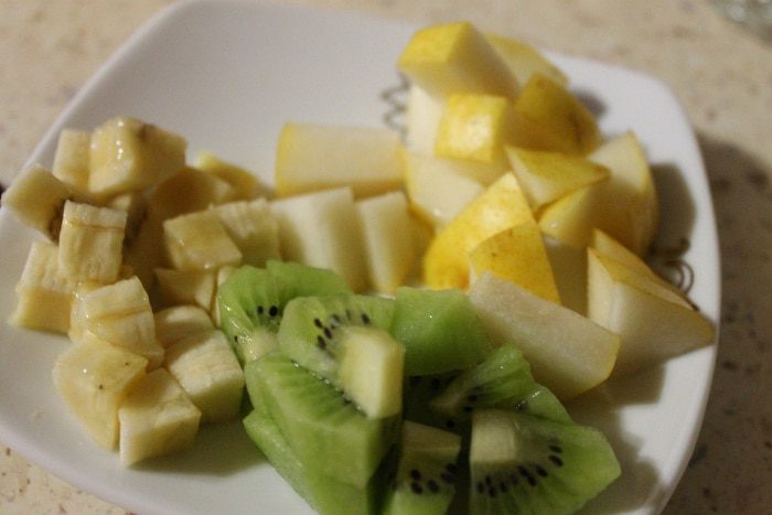 Фрукты помыть и обсушить бумажным полотенцем. Порезать крупными кубиками.