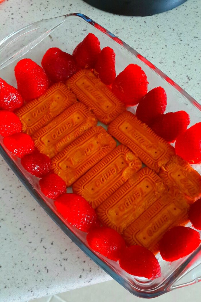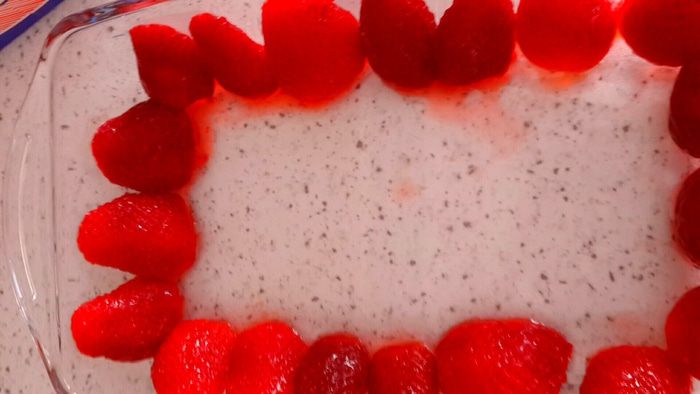 Разрезать клубничку вдоль и выложить по диаметру формы. Форму взять лучше стерляную или с разъемными бортами.