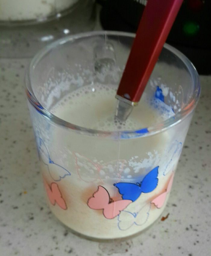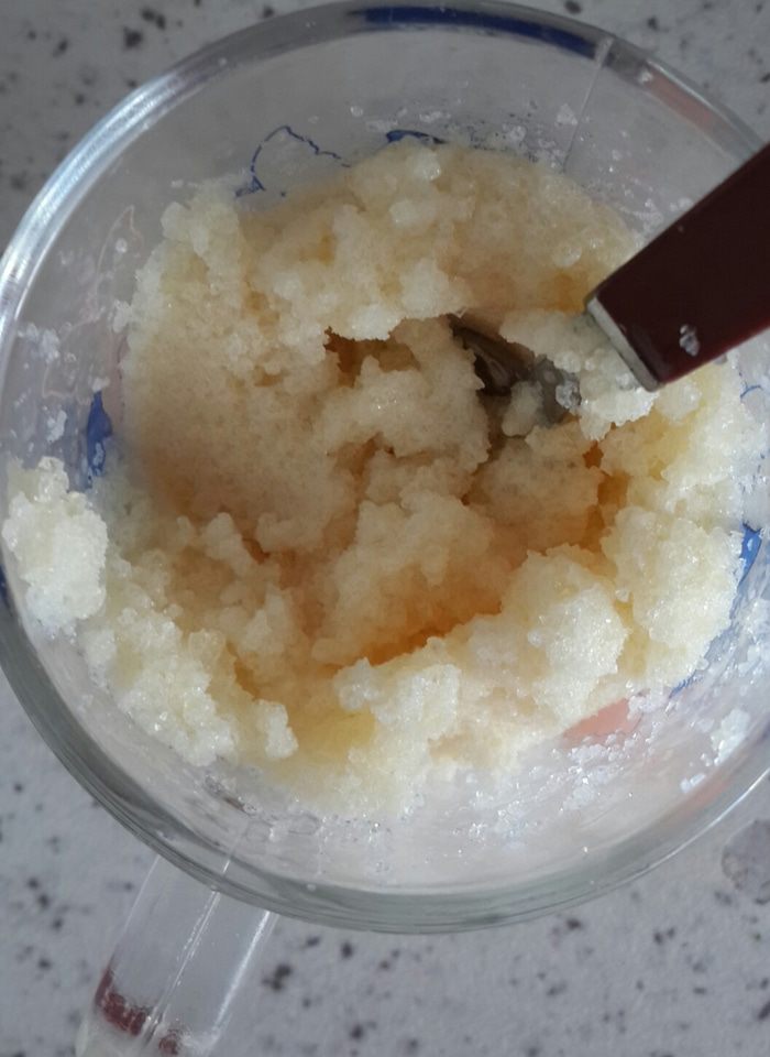 Вот так набухнет желатин. Потом смешаем желатин с творог. Если будет очень густо, то ложку молоко добавьте в творог.