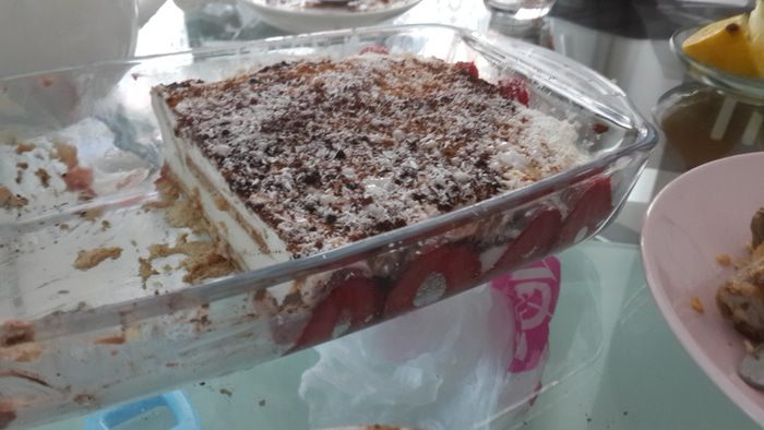 И вот ставим торг в холодильник на час. И вуаля торг готов. Посыпаем кокосовой стружкой, корицей или какао или украшаем клубникой...... как ваша фантазия подсказывает. Ха на фото пол торга нет.... подружка на чай заходила.......