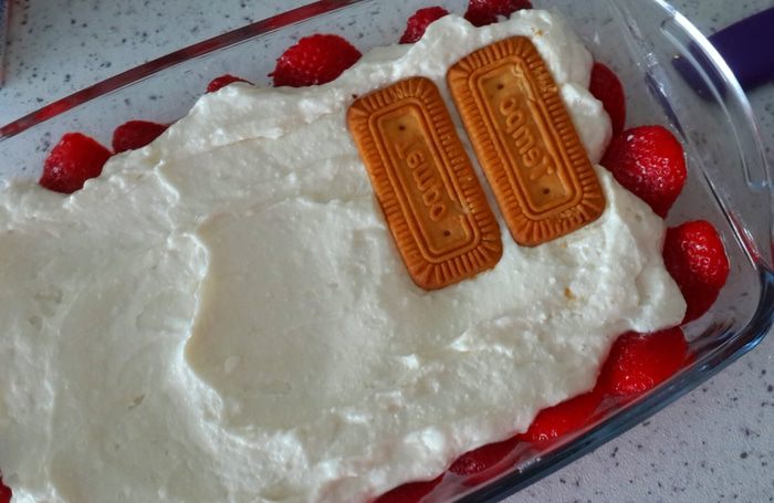 Творог выкладываем на печенье. И я решила сделать второй слой. Опять печенье и творог.