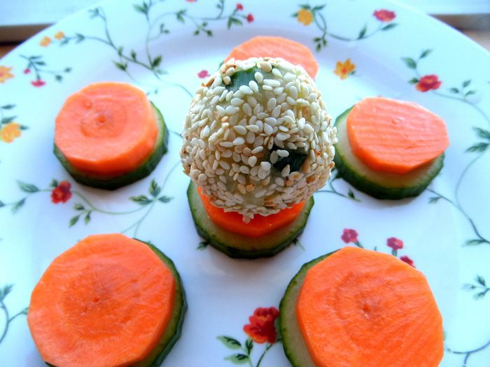 Бомбочку валяем в поджаренном солёном сезаме. Я его делаю заранее вот по этому рецепту: http://www.edimdoma.ru/retsepty/55732-solenyy-sezam-dlya-salatov