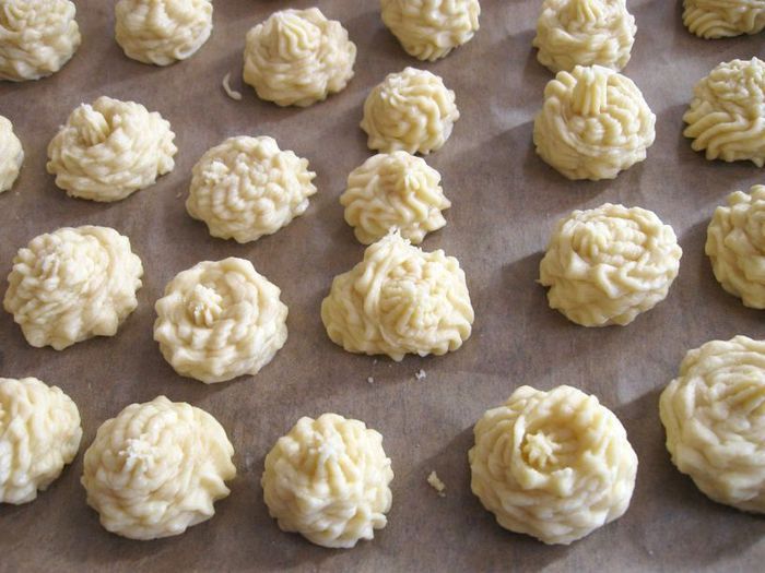 Мокрым пальцем сделать в каждом печенье углубление и положить туда джем, в который добавлен крахмал (чтобы не растекалась начинка) в пропорции 10: 1. Выпекать печенье при 200 градусах 20 минут. Минут через 15 проверить печенье, вам может потребоваться немного меньше времени.