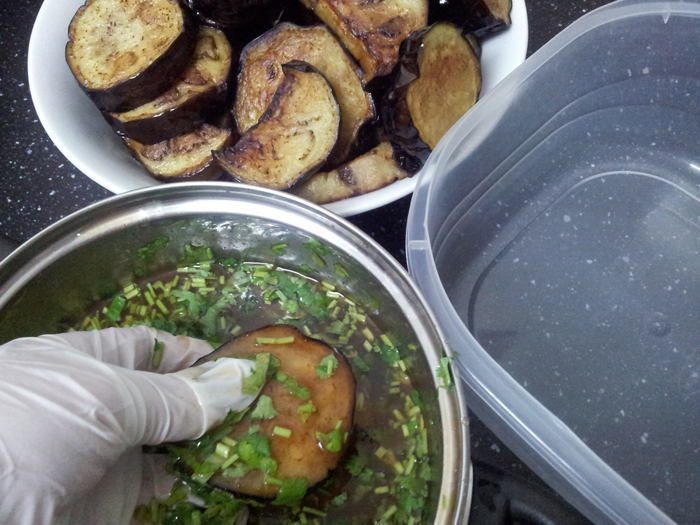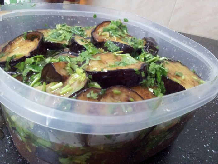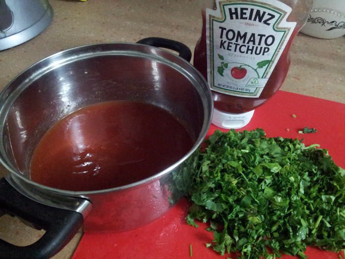 В кастрюльке делаем маринад: кетчуп, вода, уксус, чеснок (выдавить), кинза(мелко порезать), сахар, соль.