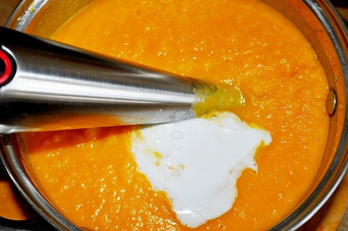 Взбить суп прямо в кастрюле погружным блендером.