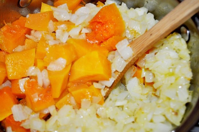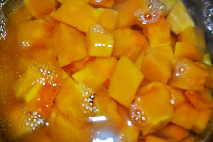 Залить тыкву 1,5 л горячей воды, довести до кипения и варить под крышкой, пока тыква не станет мягкой (минут 15).