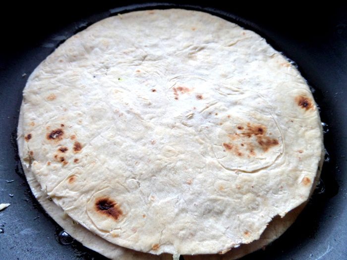 Насыпать начинку на нижнюю лепёшку,прижать.