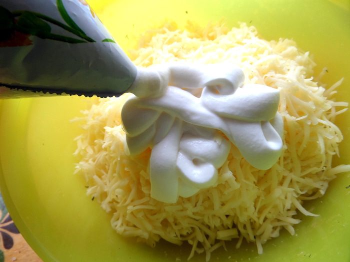 Для второй начинки в оставшийся сыр добавить сметану...