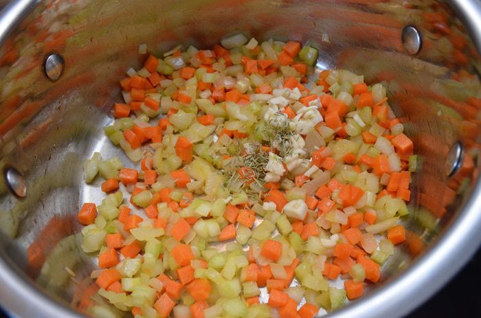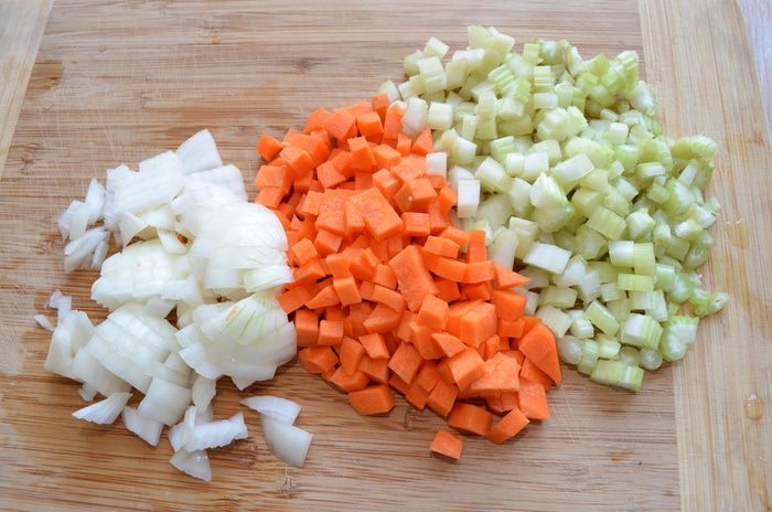 Лук, морковь и сельдерей нарезать мелким кубиком. Обжариваем с небольшим количеством оливкового масла на среднем огне до прозрачного состояния. Чеснок мелко рубим.