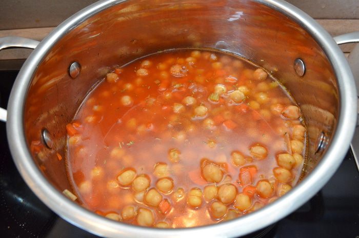 Добавляем томатную пасту, нут (пару ложек нута отложить для подачи) и горячий бульон. Варим 10-15 минут. Солим, перчим по вкусу. Я делала из отварного нута, в сухом виде около 200 г.