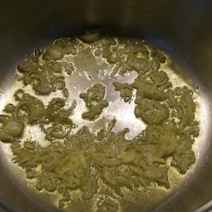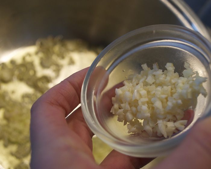 Небольшую луковицу нарезать. Чеснок мелко порубить. В кастрюле с тяжелым дном разогреть оливковое масло и положить обжариваться лук.