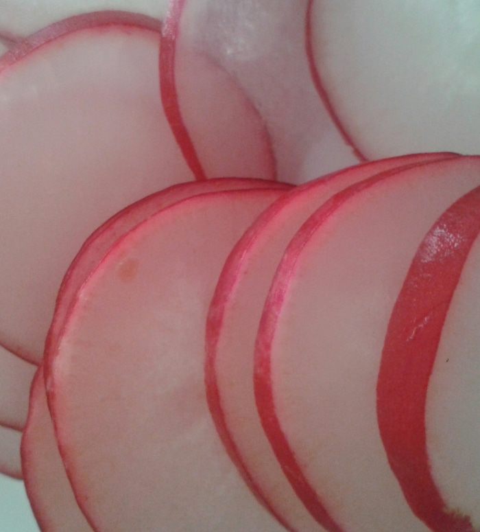 Редис моем, режем колечками.
