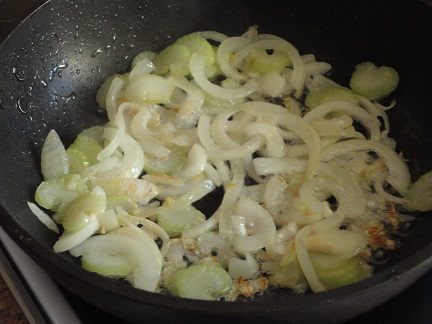 Луковицу и сельдерей нашинковать и обжарить в двух столовых ложках растительного масла до золотистого цвета. Добавить грибы, перемешать, посолить, поперчить. Потушить 5 минут.