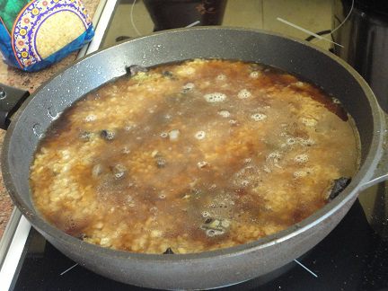 В грибы добавить кориандр, высыпать стакан булгура ТМ «Националь» и залить двумя стаканами грибного бульона или горячей воды, довести до кипения, убавить нагрев.