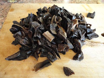 Грибы залить кипятком (2,5 стакана) на ночь. Утром отварить в этой же воде. Достать из бульона и нарезать.