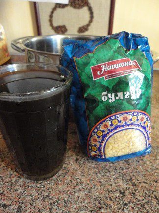 Бульон от варки грибов понадобится для варки булгура. Вам понадобится 2 стакана. Если готовили из шампиньонов, то используйте просто горячую воду.
