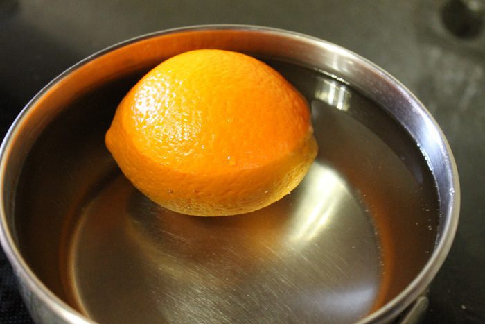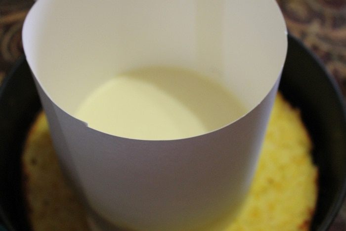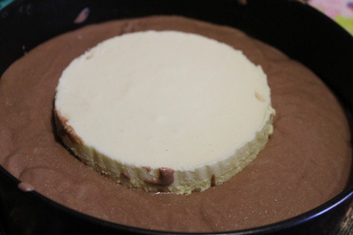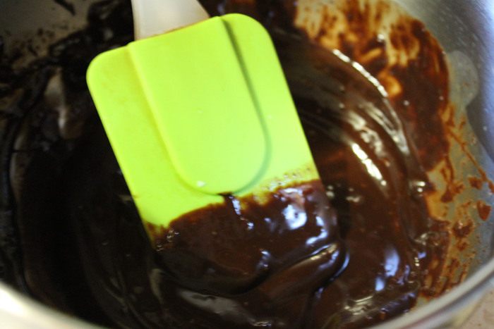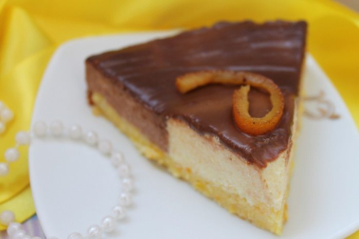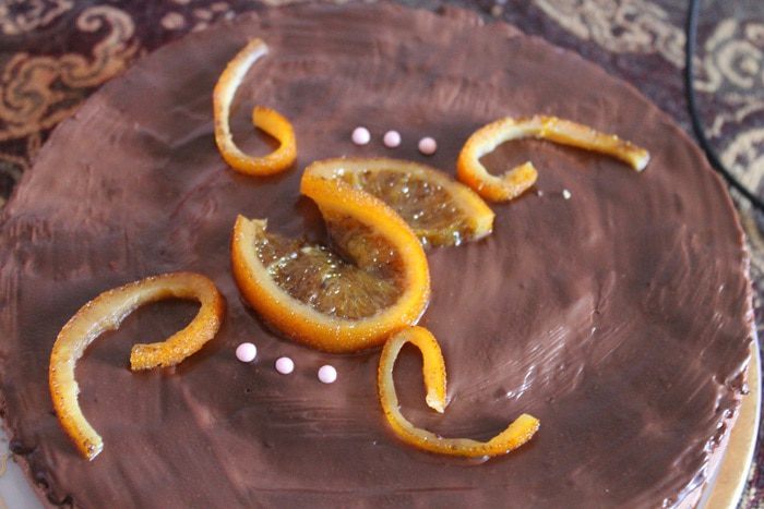 Апельсинового мусса получилось больше, я решила срезать выступающую часть. Для глазури, сливки подогреть до горячего состояния, но не кипятить. Добавить к ним поломанный на кусочки шоколад и хорошо размешать, пока шоколад не растворится. Залить получившейся глазурью торт.