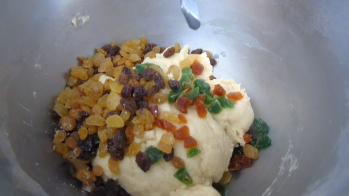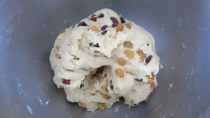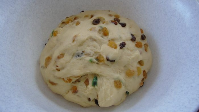 Хорошенько вымешать, чтобы цукаты равномерно распределились. Накрыть и дать подойти в теплом месте (1-1,5 часа).