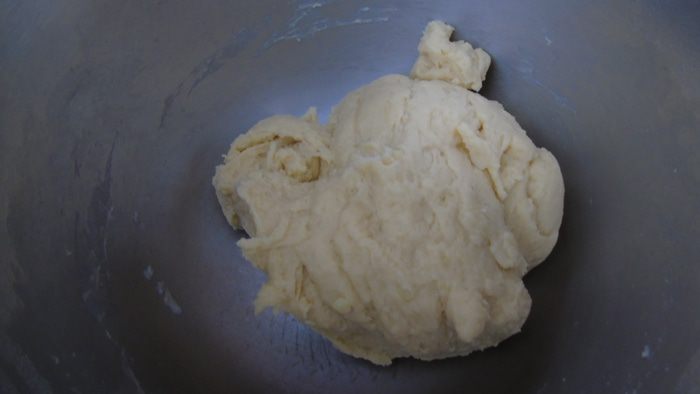 Дрожжи развести в подогретом молоке, добавить к пюре, размешать. Добавить: сахар, крахмал, желток, 80 г размягченного сливочного масла, ванильную или миндальную эссенцию по вкусу, соль и муку. Замесить эластичное тесто.