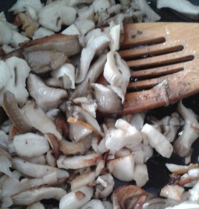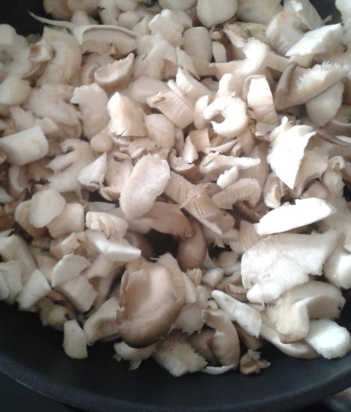 Лук мелко порубить, жарить до прозрачности, добавить чеснок затем добавить грибы, обжарить вместе около 3-5 минут.