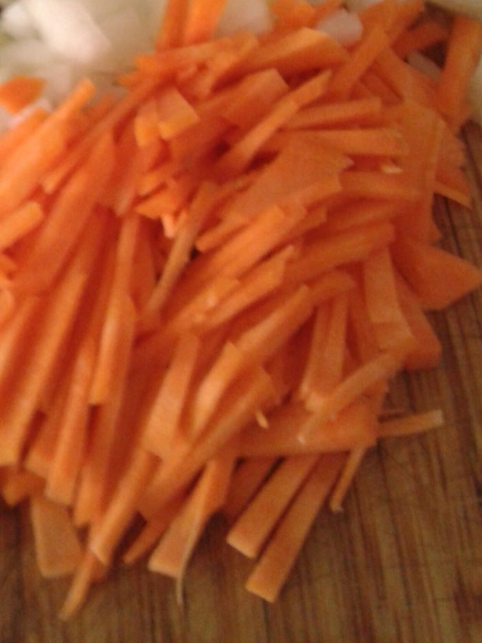 Капусту нашинковать крупно, добавить морковь. Слегка обжарить на растительном масле.