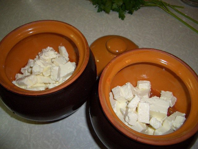 В глиняный горшочек положить половину обжаренных овощей, сверху слой брынзы, порезанной кубиками и оставшиеся овощи. Булочку размочить в молоке и покрошить в горшочек. Все перемешать и поставить в разогретую духовку на средний огонь минут на 15. Готовое блюдо посыпать зеленью петрушки.