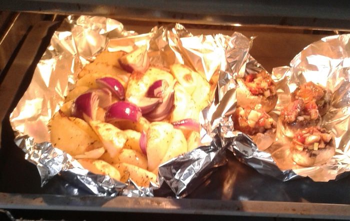 Картофель, помыть, почистить, нарезать крупными дольками. Красный лук разрезать на четыре части (у меня мелкий). Картофель с луком слегка присолить, поперчить, посыпать сухими травами, полить растительным маслом. Картофель выложить на подготовленный противень отправит в разогретую духовку до 200 градусов на 20 минут ( у меня режим конвекции с паром, если такого нет, то картофель следует накрыть фольгой, чтоб он запекся внутри).