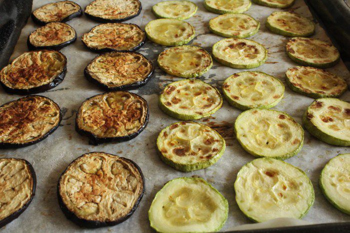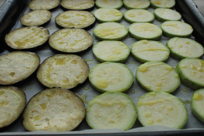 Противень застелить бумагой для выпечки, выложить колечки кабачка и баклажана, сбрызгнуть маслом и посолить.