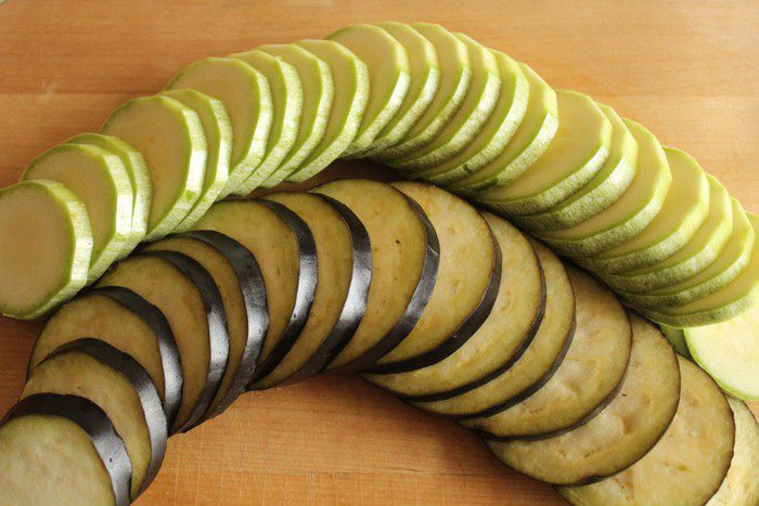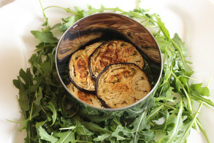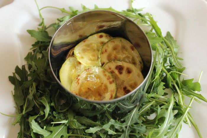 Поставить по центру кольцо. Выложить колечки кабачка и баклажана, чередуя слои.