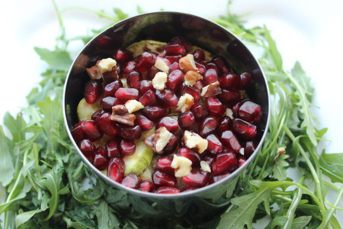 Сверху салат посыпать зернами граната и рубленными орехами.