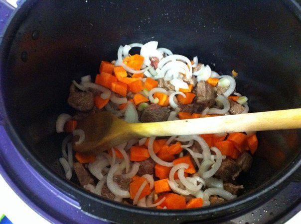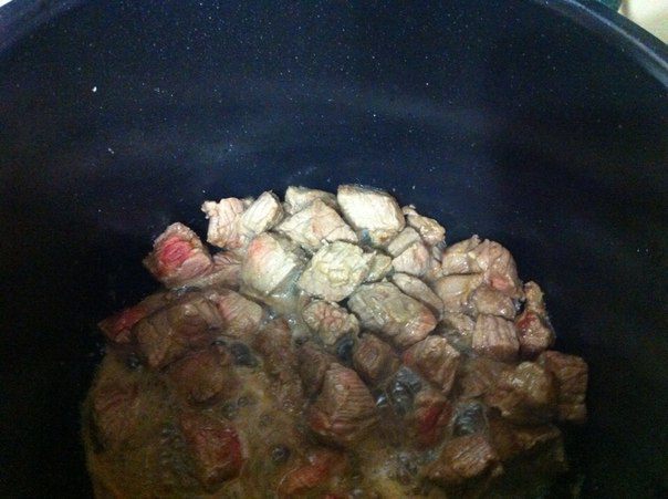 Включить мультиварку в режим "поджаривания". Разогреть масло с чесноком, затем добавить мясо, жарим около 10-ти минут, добавляем специи, соль, перец.