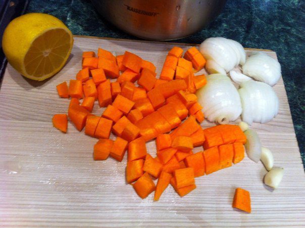 Морковь режим кубиками, лук - полукольцами, чеснок я оставляю целиком (желающие потом могут его достать и выбросить).