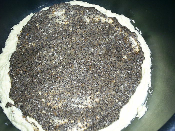 Я выпекала в мультиварке. Выкладываем половину теста, затем равномерно распределяем маковую прослойку и сверху выкладываем вторую половину теста. Выпекаем на программе "Выпечка" (45+20минут). Можно выпечь запеканку в духовке. Форму берем диаметром 20-22см, выпекаем при 180 градусах примерно 45 минут.