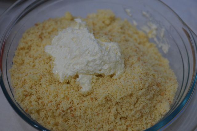 Добавляем по столовой ложке любимый масляный крем (у меня осталась небольшая пиала после приготовления торта), перемешиваем рукой, контролируя консистенцию "теста" (не сухое, но и не слишком влажное).