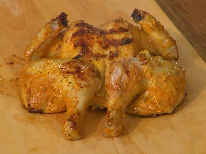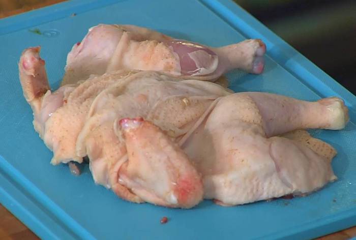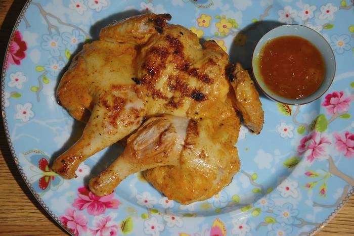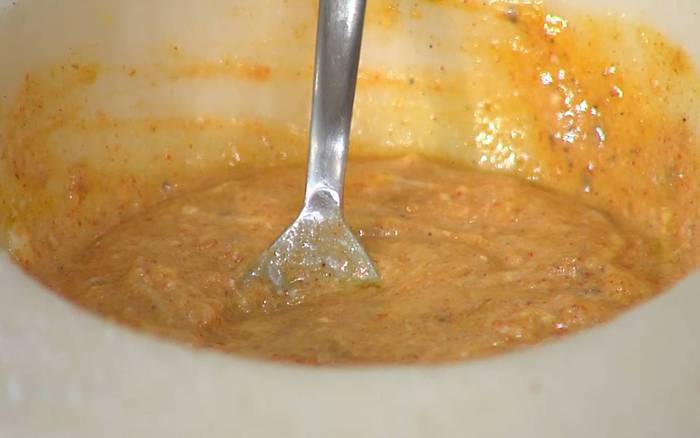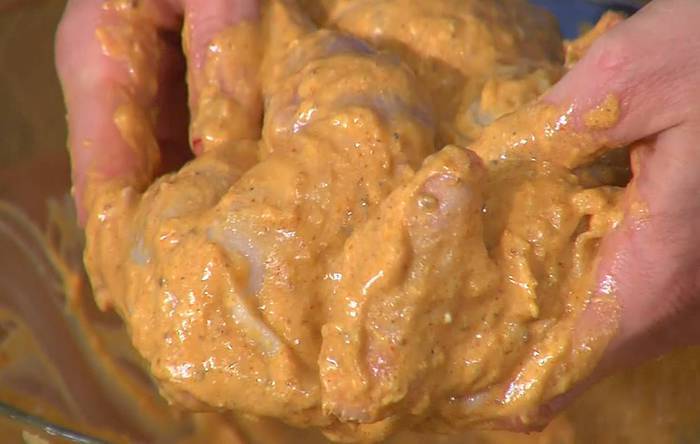 Приготовить маринад: чеснок почистить и растереть в ступке, добавить натертый имбирь и еще немного растереть, всыпать паприку, куркуму, гарам масала, зиру, мускатный орех, кориандр, посолить и поперчить, влить сок лимона, оливковое масло и перемешать, затем добавить кокосовые сливки, томатную пасту, йогурт и еще раз все перемешать.